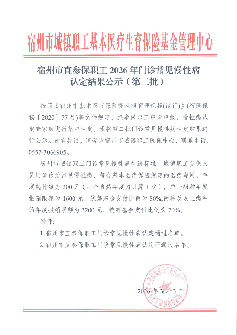 宿州市直参保职工2026年门诊常见慢性病认定结果公示(第二批)